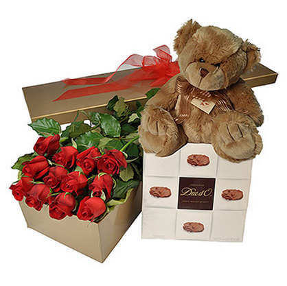 12 STUNNING LONG STEM RED ROSES PRESENTED IN A LONG GIFT BOX WITH A CUTE MEDIUM TEDDY BEAR AND MEDIUM ASSORTED CHOCOLATES